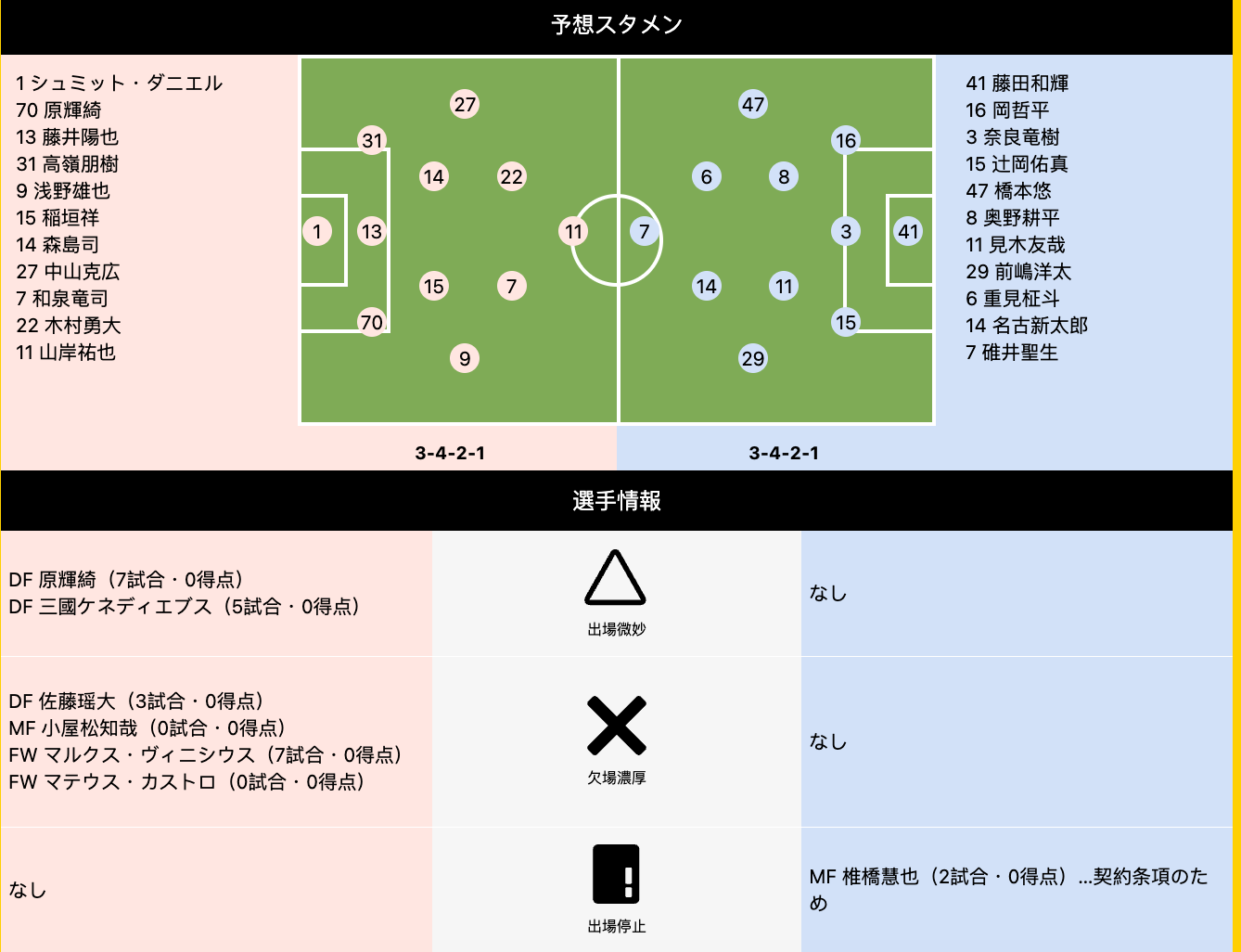 福安黄蜂目前是排名垫底,当然最近的状态还不错,上场比赛击败了长崎,最近4轮都是保持着不败。不过这个赛季的首回合交锋,他们在主场曾经1:5输给过对手,心理不占优。同时,球队主力后腰椎橋慧也租借来自对手,并无比赛资格,这是主要问题。
