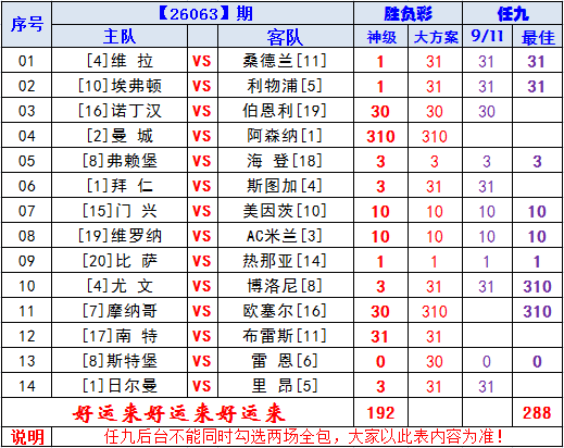 任九作为14场的互补单子,一般回避热门,自动防冷盲,任九做好的单子不要四平八稳,那样一般情况下是不会中奖的,就算是偶尔中了也必然会是火锅,从投资的角度来说,任九做单思路必须是奔着大奖走,必须有细水长流的长远计划,任九是奖池型,适宜将以小博大发挥到极致,而我玩任九有个宗旨就是热门场次尽量不选,擅用胆材,正所谓:恶向胆边生,胆从险中求!